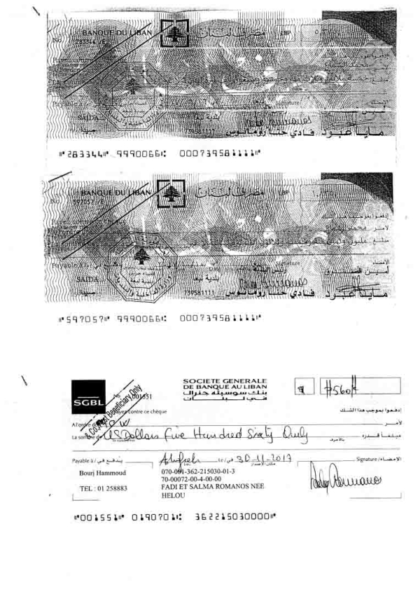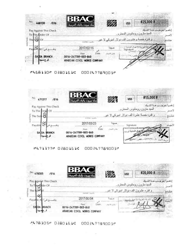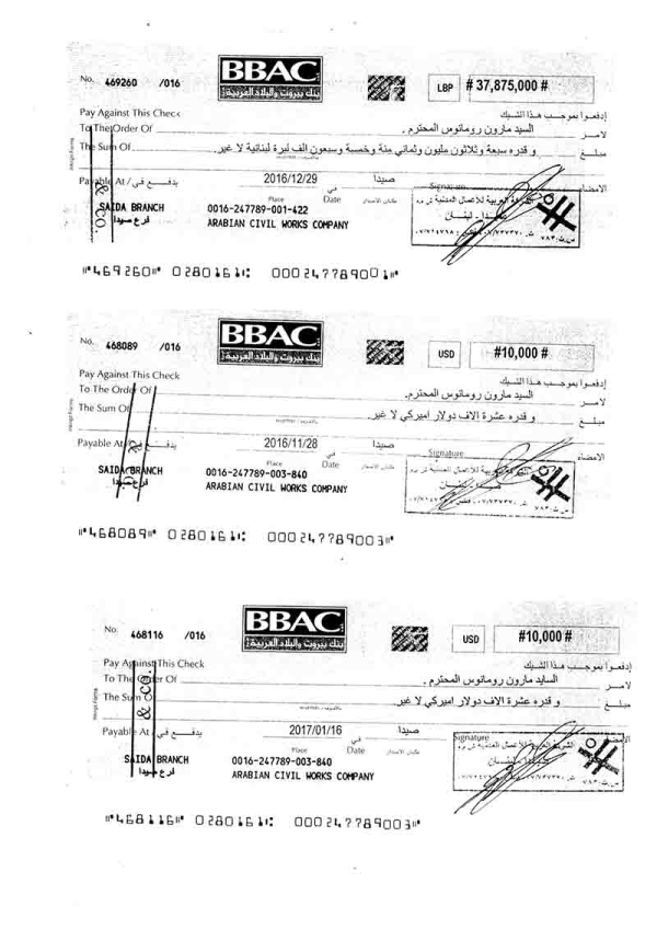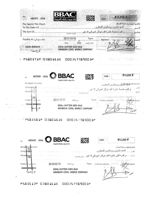 (مرفق بعض الصور لشيكات صادرة عن الشركة لصالح المهندس مارون رومانوس لقاء دفع فواتير مستحقة له).