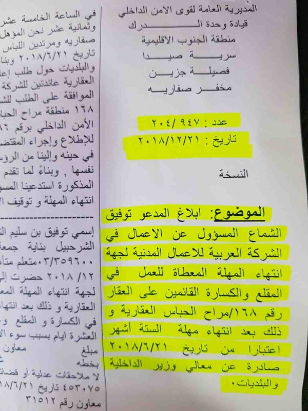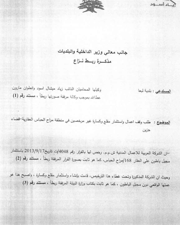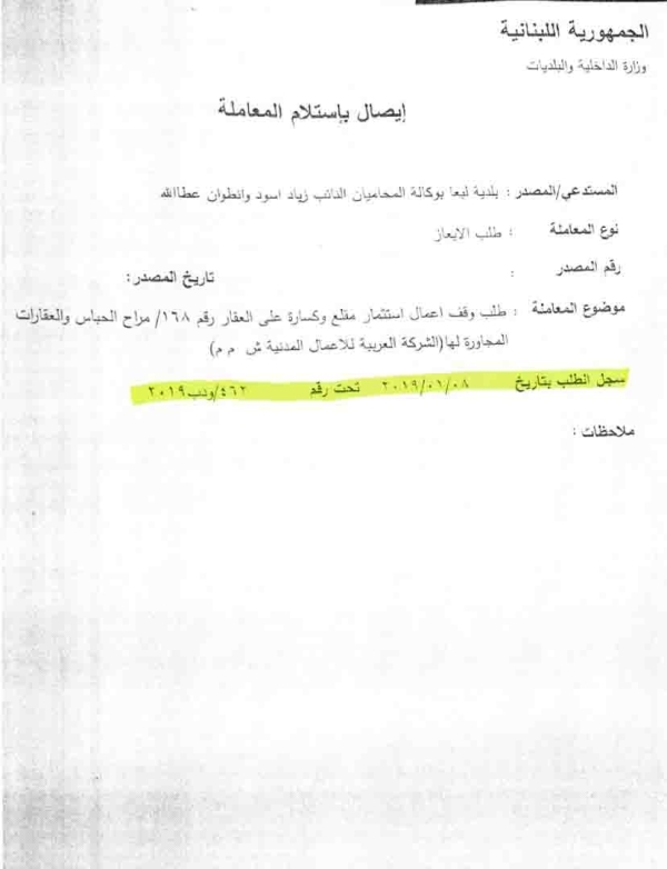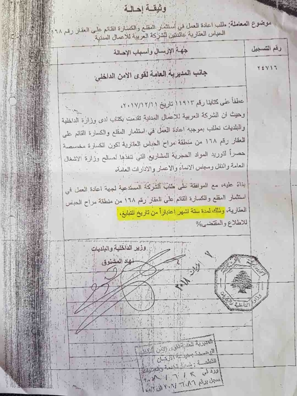 يهم الشركة العربية للأعمال المدنية ان توضح أن المقلع الموجود في العقار هو قديم ويعود الى فترة السبعينيات. ومؤخراً استحصلت الشركة على رخصة قانونية مؤقتة لمدة ستة أشهر من وزارة الداخلية والبلديات ( صورة مرفقة ) لتشغيل المقلع والكسارة بهدف توريد الناتج حصرا لصالح وزارة الأشغال العامة والنقل والادارات العامة وليس لغايات تجارية . وكان من ضمن المواد التي قامت بتوريدها ما تم استخدامه في مشاريع طرق لـ 15 بلدة جزينية. علماً انه عند انتهاء المهلة وكما تبلغت الشركة ببدء المهلة سابقاً،تبلغت بمحضر رسمي في مخفر صفاريه انتهاء الأعمال بتاريخ 21 كانون الأول 2018 . وقد التزمت الشركة واغلقت الكسارة فور انتهاء المهلة، وهي ليس لديها اي نية باعادة فتحها لأنها ليست بحاجة لذلك (مرفق صورة عن محضر الإغلاق).