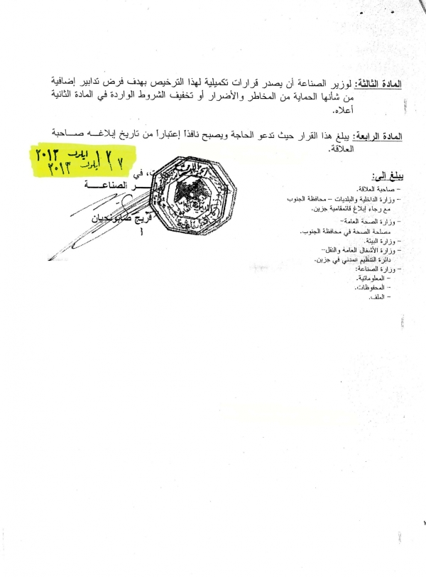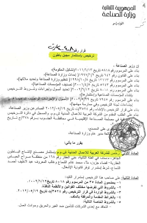 - في 17 ايلول 2013 حازت الشركة على ترخيص باستثمار مجبل باطون في منطقة مراح الحباس العقارية قرار رقم 4048/ت صادر عن وزارة الصناعة. ومؤخرا تم الكشف عليه من قبل الوزارة وابداء بعض الملاحظاتلجهة ضرورة اقامة برك ترسيب لإعادة استخدام المياه المستعملة بغية ترشيد استهلاكها ، وللقيام بحملة تشجير وتفكيك مجبل باطون قديم موجود في العقار نفسه، وتم تنفيذ كل ما طلبته وزارة الصناعة واصبح الموقع مطابقا لكافة الشروط والمواصفات المطلوبة . (مرفق صور الترخيص وصور برك الترسيب والتشجير).