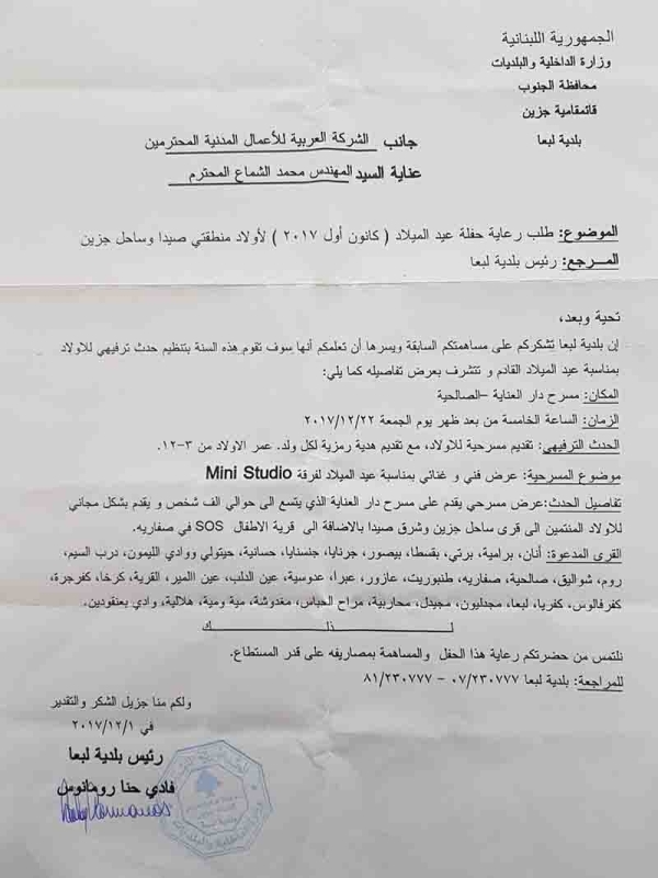 ألم يكن أيضاً هذا المجبل" الشرير" موجوداً حين طلبتم من الشركة رعاية حفل ترفيهي بعيد الميلاد في نهاية العام 2017؟!. والحقيقة أن الشركة تمنعت عن قبول هذا الطلب لأننا كنا ندرك ما يبيته لنا السيد رومانوس في الخفاء (مرفق صورة عن طلب رعاية الحفل).