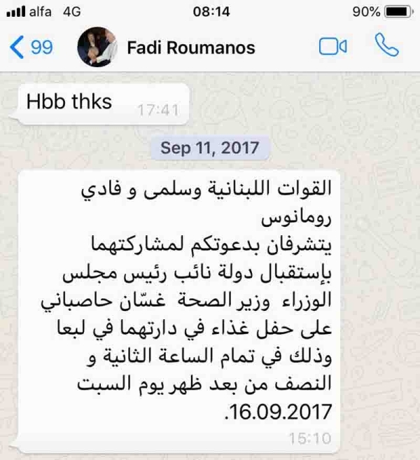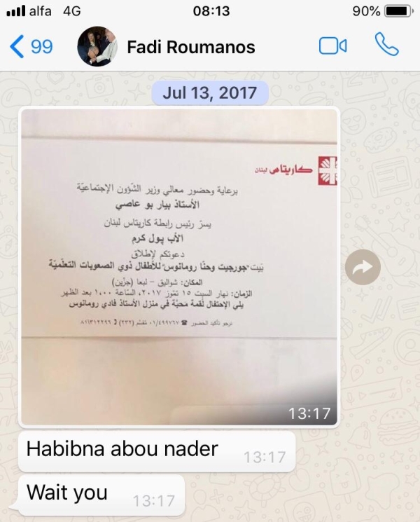 وإذا كانت الشركة بهذا السوء كما تزعمون لماذا وجهتم الدعوات لمديرها التنفيذي لحضور مناسبات عائلية في دارتكم، وتخاطبونه "حبيبنا أبو نادر" حسب الرسائل النصية " واتس اب". (مرفق صورة عن الرسائل النصية).