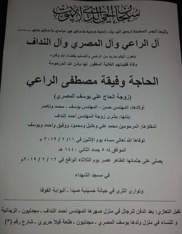 وفاة الحاجة وفيقة مصطفى الراعي والدة المهندسين حسن و يوسف المصري ووالدة زوجة المهندس احمد محمود النداف