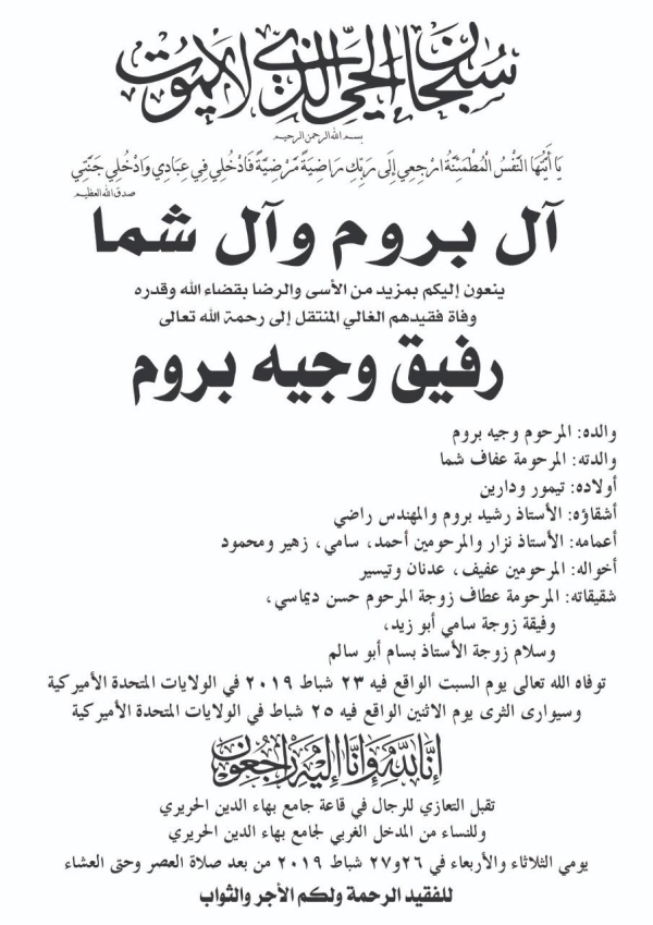 شكر وعرفان لكل من شارك في عزاء والدة القاضي زاهر حمادة