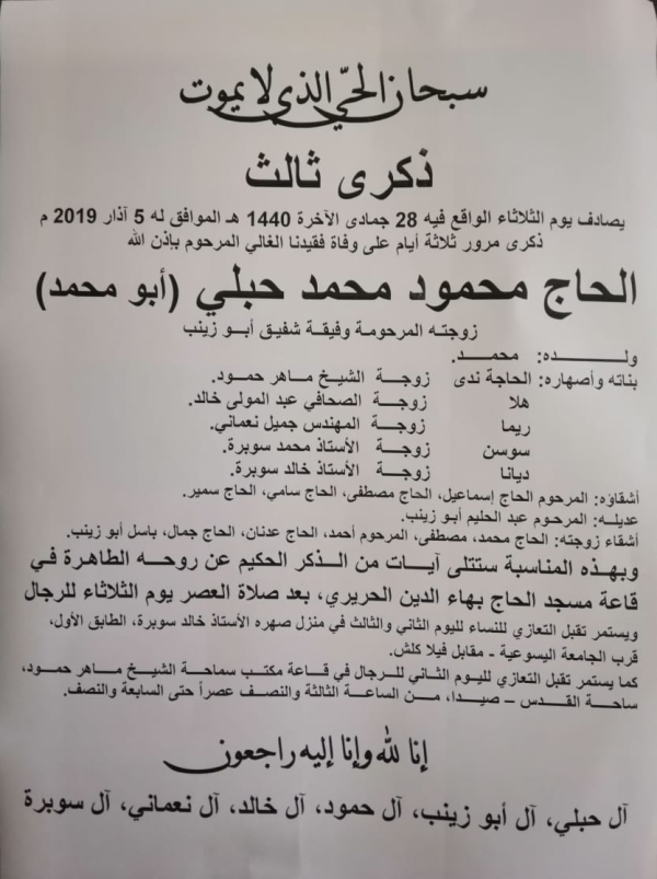 شكر وعرفان لكل من شارك في عزاء والدة القاضي زاهر حمادة