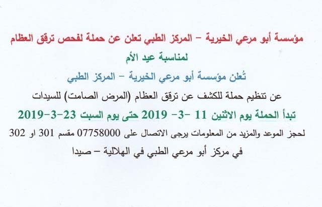 لمناسبة عيد الأم، تُعلن مؤسسة أبو مرعي الخيرية - المركز الطبي، عن تنظيم حملة للكشف عن ترقق العظام (المرض الصامت) للسيدات، حيث تبدأ الحملة يوم الاثنين 11 -3- 2019 وتنتهي يوم السبت 23-3-2019، وذلك في مركز "أبو مرعي الطبي" في الهلالية – صيدا.