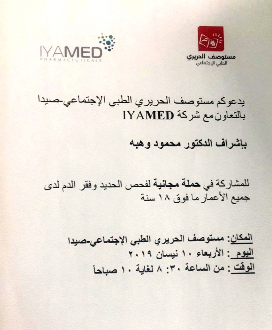 ينظم " مستوصف الحريري الطبي الاجتماعي – صيدا " بالتعاون مع شركة "IYAMED" بإشراف الدكتور محمود وهبة حملة مجانية لفحص الحديد وفقر الدم لجميع الأعمار فوق 18 سنة .