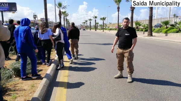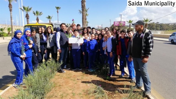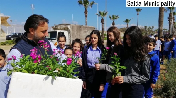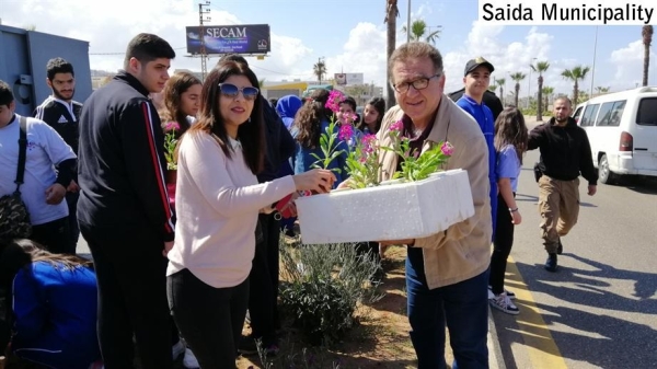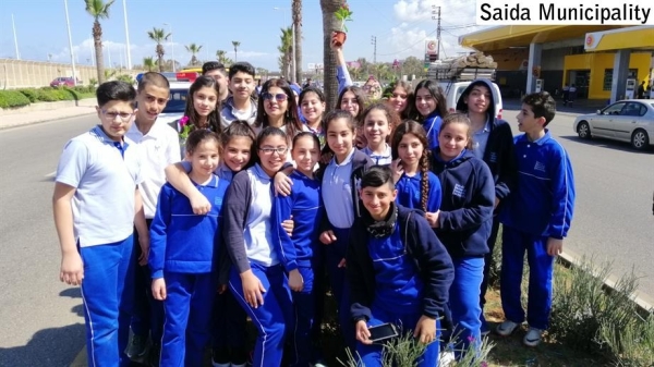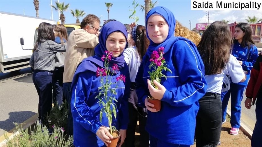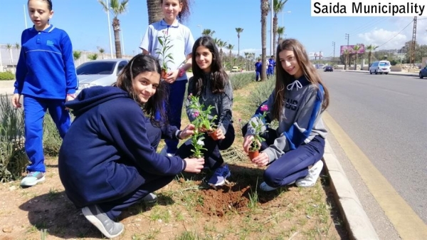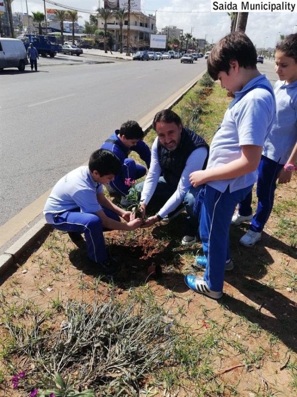 طلاب مدرسة البهاء في صيدا يزرعون شتلات ورود في وسطية مدخل صيدا الشمالي عوضا عن الشتلات التي تلفت في سباق الماراتون