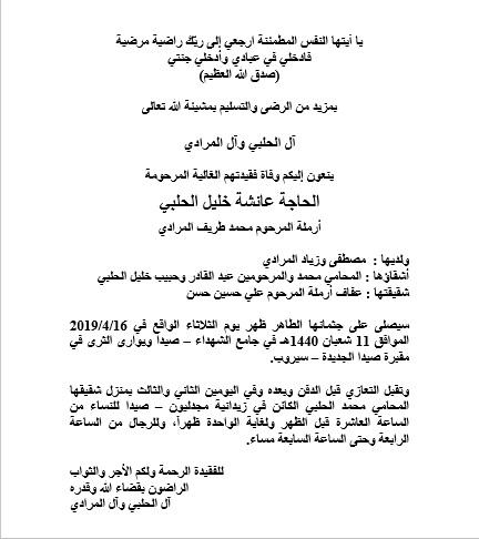 وفاة الحاجة عائشة خليل الحلبي أرملة المرحوم محمد طريف المرادي