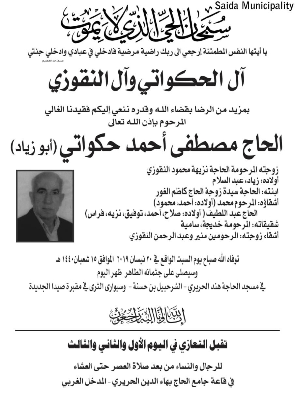 يتقدم المجلس البلدي في مدينة صيدا برئاسة المهندس محمد السعودي بأحر التعازي إلى رئيس المصلحة الهندسية في بلدية صيدا الدكتور المهندس زياد حكواتي بوفاة والده المرحوم الحاج مصطفى أحمد حكواتي . كما يتقدم بالتعزية إلى عائلته الكريمة، سائلين الله عز وجل له المغفرة والرحمة، وأن يسكنه فسيح جنانه ، وأن يلهم عائلته الكريمة ومعارفه ومحبيه الصبر والسلوان.