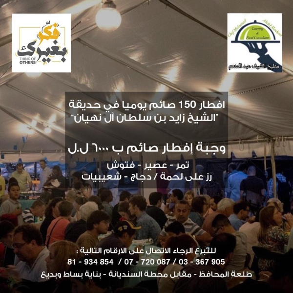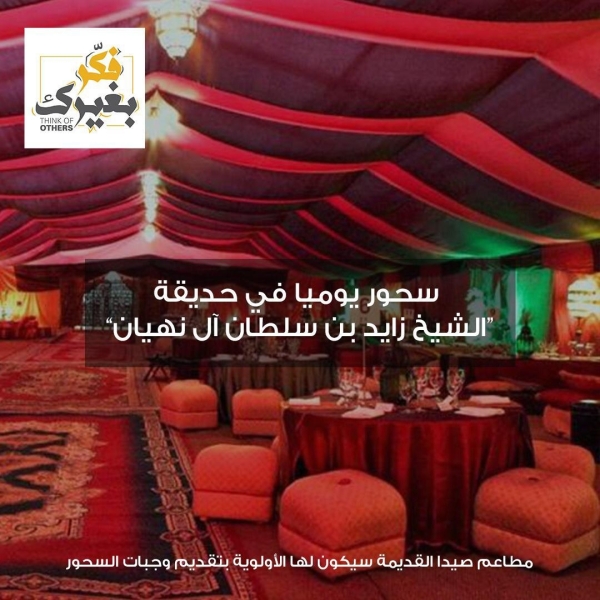 يذكر أيضا ان مبادرة الخيمة الرمضانية في حديقة الشيخ زايد هي مبادرة شبابية قام بها عدد من شباب صيدا بقيادة السيد يحيى النتوت، بالتعاون بين مجموعة "فكر بغيرك" ومطبخ "مطبخنا"، حيث ستقوم المبادرة بتقديم ١٥٠ وجبة افطار بشكل مجاني يوميا بالاضافة الى السحور بمشاركة مطاعم البلد القديم.