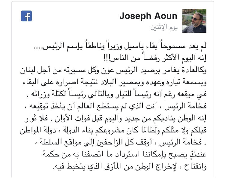 علق ابن أخي الرئيس ميشال عون، جوزف الياس عون، عبر حسابه في "فايسبوك" على التطورات السياسية في البلاد بعد 12 يوماً على الاحتجاجات الشعبية، وقال عون: "لم يعد مسموحاً بقاء باسيل وزيراً وناطقاً باسم الرئيس، إنه اليوم الأكثر رفضاً من الناس"، مضيفاً: "كالعادة يغامر برصيد الرئيس عون وكل مسيرته من أجل لبنان وبسمعة تياره وعهده وبمصير البلاد نتيجة إصراره على البقاء في موقعه رغم أنه رئيس للتيار وبالتالي رئيساً لكتلة وزرائه".