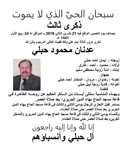شكر وعرفان لكل من شارك في عزاء والدة القاضي زاهر حمادة