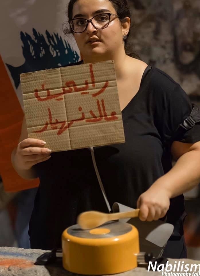 ، وقفت في ساحة رياض الصلح مساء اليوم الأحد وهي حاملة تبصرها على يافطة في الوقت الذي تطرطق به على " طنجرتها" لتصدر أصوات مزعجة كتعبير عن الرفص للسلطة، وقد تبنت الأنتفاضة هذا الأسلوب وأعتمدته في حراكها السلمي وايضا عن مطالبتها بتغير السلطة الفاسدة ومحاسبتها حيث الشعار الذي ما زال في طليعة مطالب الأنتفاضة وهو " كلن يعني كلن".