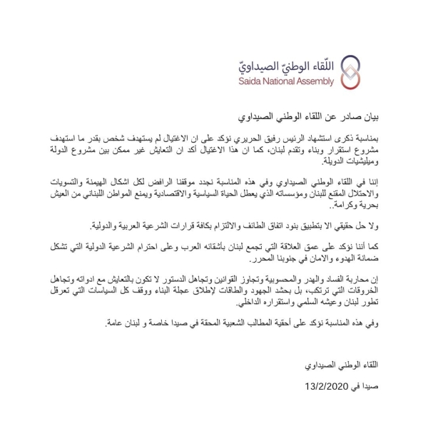 بعد ثورة 17 تشرين التي اربكت ساحات الاحزاب السياسية التقليدية في مدينة صيدا، فمنهم من دعم الثورة اواستثمر فيها اوحاول ان يعزز مكانته في المدينة ومنهم من لم يحرك ساكنا، بالاضافة الى التجماعات السياسية المعروفة وهي اللقاء التشاوري المدعوم من تيار المستقبل واللقاء الديمقراطي المدعوم من التنظيم الشعبي الناصري وهيئة علماء المسلمين في صيدا المدعومة من الجماعة الاسلامية وتجمع رجال الاعمال والمهندسين، ظهر مولودا جديدا منذ حوالي اسبوع في مدينة صيدا صدر عنه بيانين واتخذ لنفسه اسم "اللقاء الوطني الصيداوي" وهو مجهول الاب والام وان كان بعض اعضاءه معروفين حتى لو لم يظهروا على الاعلام بعد.