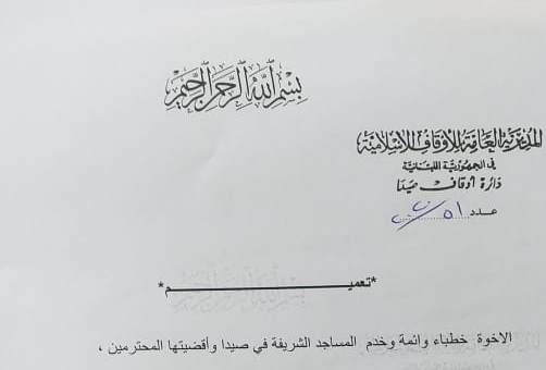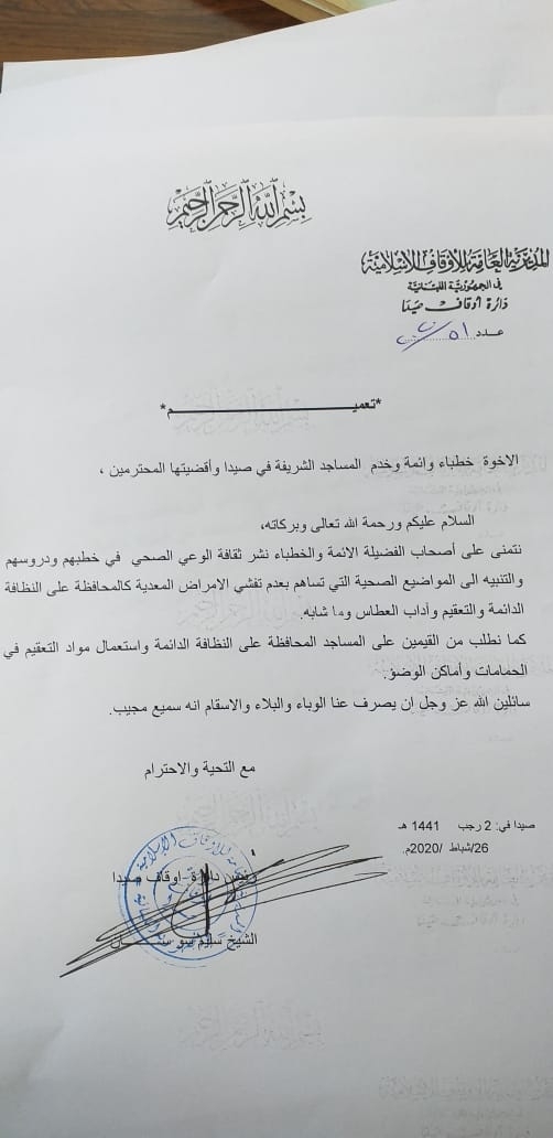 في سياق الاجراءات الاحترازية التي تأخذها دار الافتاء في مدينة صيدا للوقاية من فيروس كورونا، أصدر مفتي صيدا واقضيتها الشيخ سليم سوسان تعميما على خطباء المساجد في مدينة صيدا طالبا منهم نشر ثقافة الوعي الصحي في خطبهم ودروسهم والتنبيه على المواضيع الصحية المستجدة.