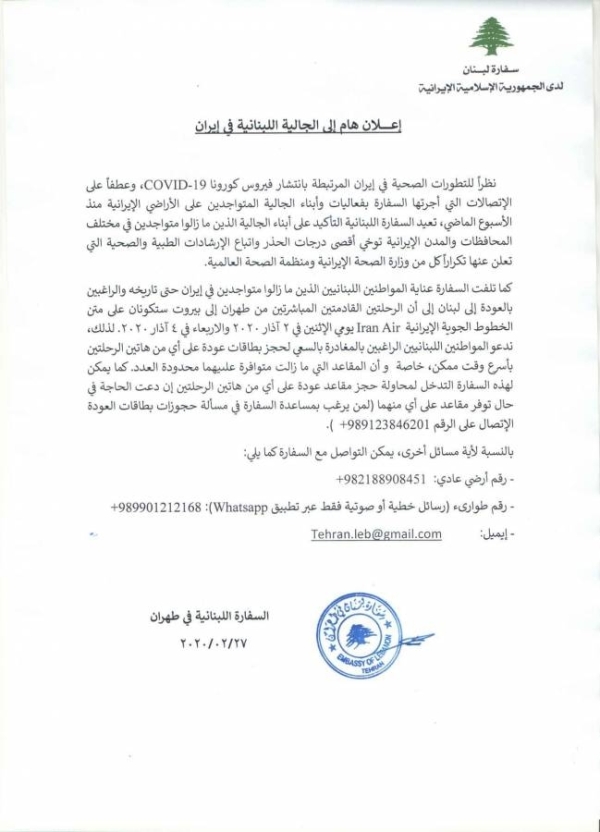 صدر عن السفارة اللبنانية في طهران إعلان للجالية اللبنانية جاء فيه: "ندعو المواطنيين الراغبين بمغادرة إيران للحجز على الرحلتين في 2 و 4 آذار المقبلين".