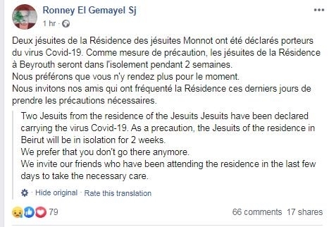 اعلن أحد الاباء اليسوعيين على حسابه على فيسبوك أن احد الآباء المقيمين في دير مونو هو مصاب بفيروس كورونا