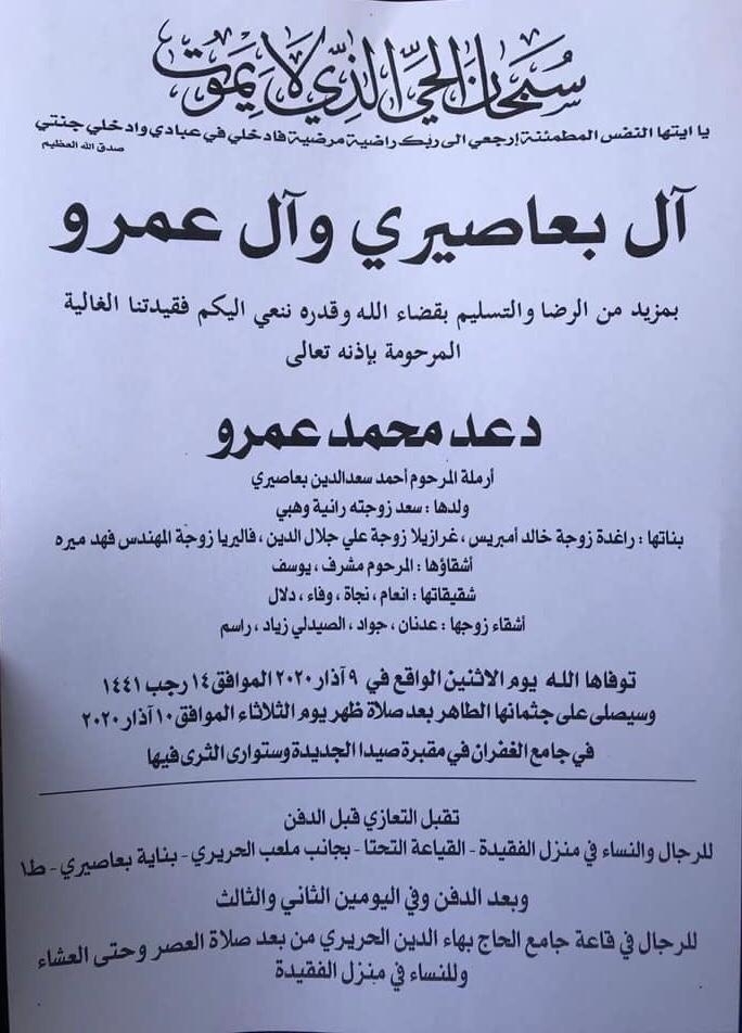 وفاة المرحومة دعد محمد عمرو