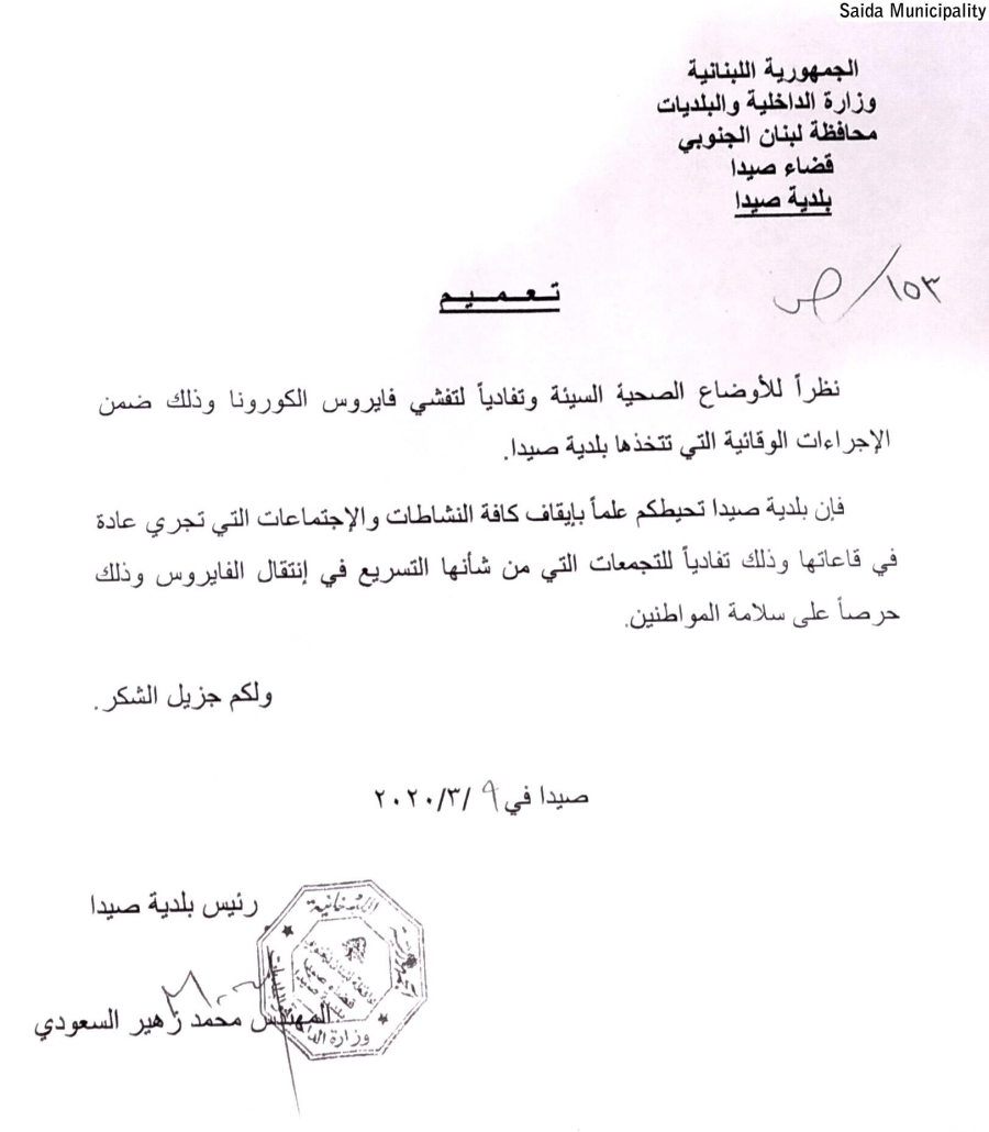 السعودي أعلن ايقاف النشاطات والإحتفالات في قاعات بلدية صيدا كتدبير إحترازي وقائي من فيروس كورونا