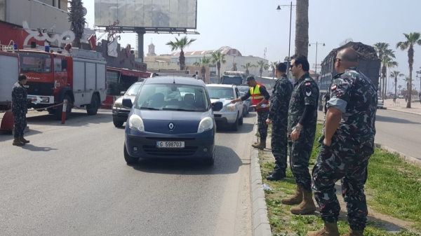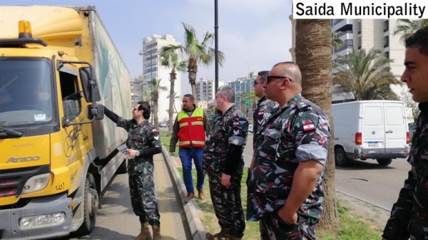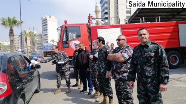 رجال سرية الاطفاء يوزعون بروشورات توعية من فايروس كورونا وسبل الوقاية، والارشادات الصحية الواجب اتباعها منعا لانتقال العدوى على الكورنيش البحري مقابل مركز السرية