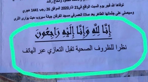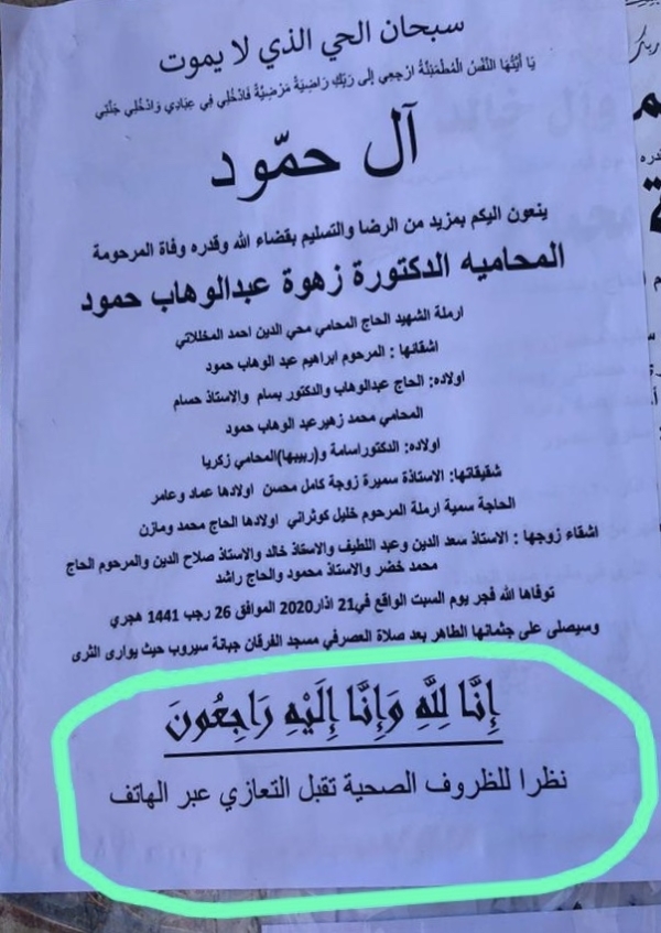 بسبب الاوضاع الصحية وانتشار فيروس كورونا وتجنب اللقاءات الاجتماعية خصوصا تقبل العزاء، كان هذا القرار الجريئ من آل حمود بعد وفاة المرحومة المحامية زهوة عبدالوهاب حمود حيث قررت للعائلة تقبل التعازي عبر الهاتف، اي عن بعد، وهذا ما يجب ان الاخذ به عند المسلمين والمسيحين بالاسغتناء عن تقبل العزاء في قاعات المساجد والكنائس حتى يذهب عنا هذا الوباء كليا.
