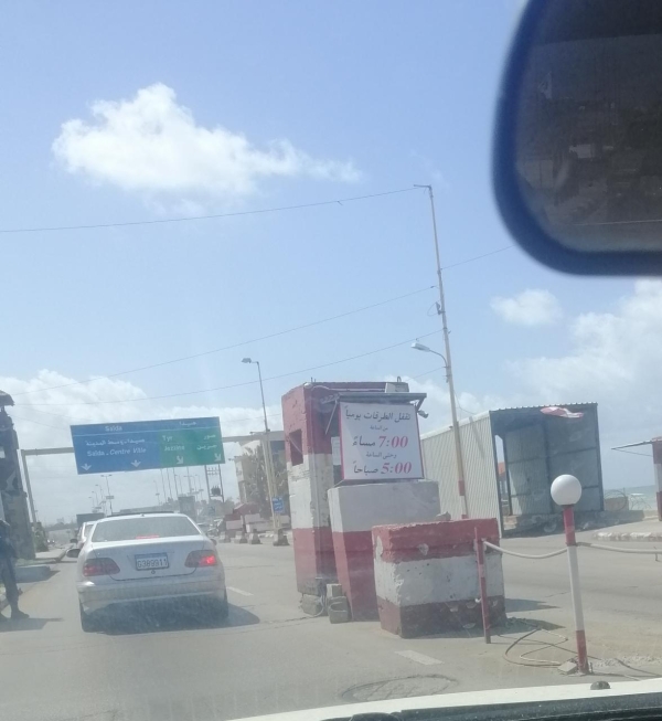 حرصا منه على سلامة المواطنين وتنفيذا للاجراءات الامنية التي اتخدتها الحكومة بنمع التجول قام الجيش اللبناني برفع يافطة عند مدخل محافظة الجنوب في منطقة الاولي تحدد ساعات العبور على الطريق الدولية من السابعة مساء وحتى الخامسة صباحا.
