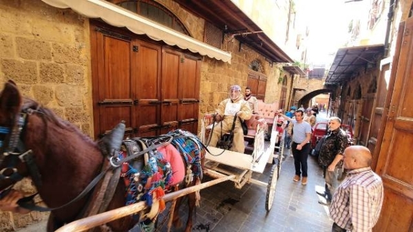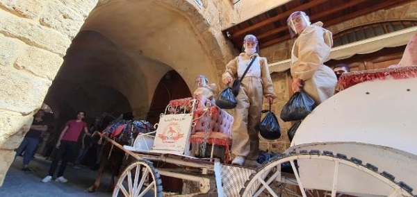 كشاف المسلم يستخدم الحنطور لتوزيع المساعدات في صيدا القديم