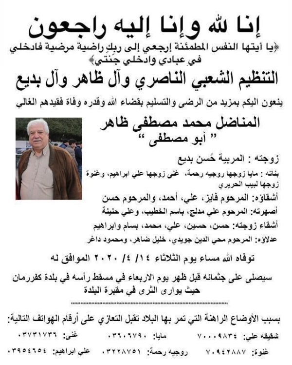 انتقل الى رحمة الله القيادي في التنظيم الشعبي الناصري محمد ضاهر ابو مصطفى انا لله وانا اليه راجعون
