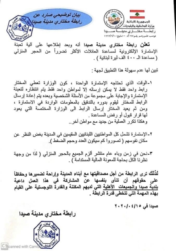 رابطة مخاتير صيدا تعلن عن نأيها بنفسها من المشاركة في مساعدة ال ٤٠٠ الف ليرة لبنانية وتدعو البلدية والجمعيات الاهلية القيام بهذه المهمة