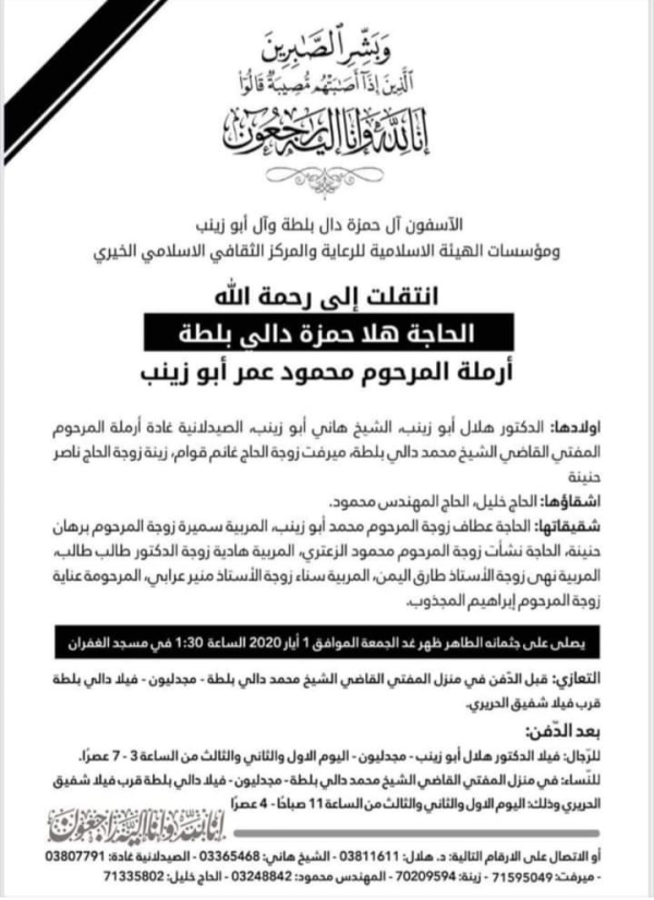 وفاة عضو لجنة صديقات الرعاية المرحومة الحاجة هلا حمزة دالي بلطة أبو زينب