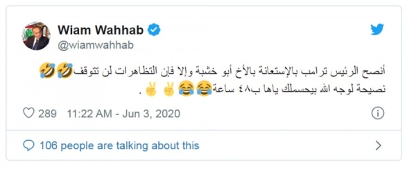 قال رئيس حزب التوحيد العربي وئام وهاب عبر حسابه على تويتر “أنصح الرئيس ترامب بالإستعانة بالأخ أبو خشبة وإلا فإن التظاهرات لن تتوقف...نصيحة لوجه لله بيحسملك ياها ب ٤٨ ساعة"