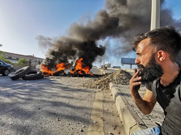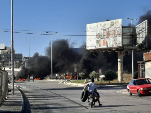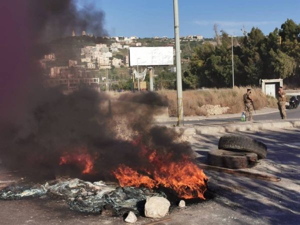 بالصور قطع الطريق بالاطارات المشتعلة على اتوستراد مدخل صيدا الجنوبي في منطقة سينيق