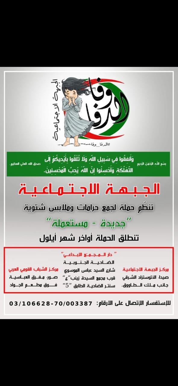 تنظّم #الجبهة_الاجتماعية في الشباب القومي العربي، حملة "الدفا وفا" التي تنطلق في أواخر شهر أيلول.