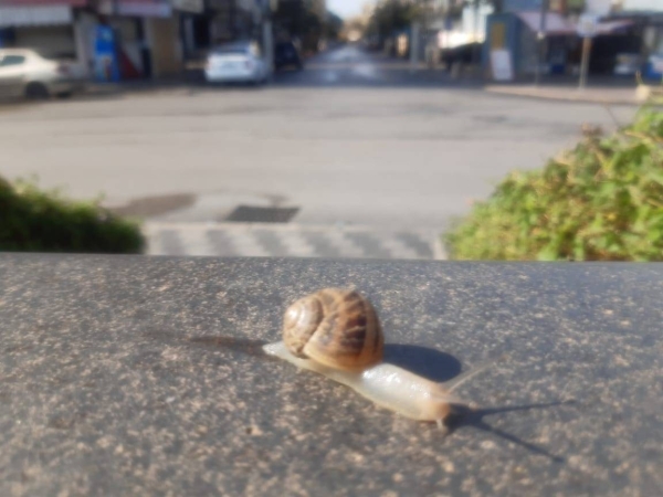 على تنهاهي صغر حجمها وبطء حركتها لفتت نظره وكان قدرها ان تمر في مرمى عدسته ليحمّلها وزراً اثقل من "َصدَفتها " التي تجرها خلفها وتتخذها بيتا تسكن اليه عند الملمات .. مسقطاً وتيرة زحفها الكسول المتثاقل على واقع الحركة الخفيفة والحياة المتباطئة الى حد الجمود في المؤسسات المقفلة والشوارع المقفرة في ظل سريان مفعول مقررات التعبئة العامة من اقفال وحظر تجول وقيود على تنقل السيارات .