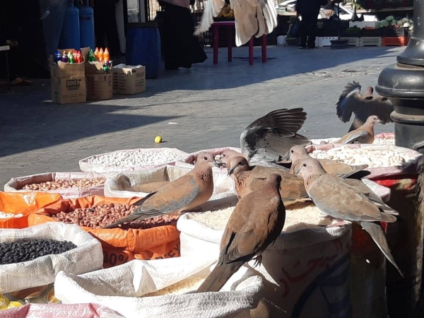 في احد محال السمانة في سوق شعبي عند محلة البوابة التحتا على الواجهة البحرية لمدينة صيدا ، تغط بضع يمامات على أكياس مفتوحة من الحبوب لتلتقط بعضا منها على مرأى من صاحب المحل دون ان يبعدها او يحرك ساكناَ ، ولسان حاله ، انه يتركها تلتقط رزقها ، لأن " الرزق على الله " ونحن كما ترون الحال واقف بسبب الأزمة المالية وجائحة كورونا لكننا لا نستطيع الا ان نفتح ولو كان البيع بالحد الأدنى لأن الحياة يجب ان تستمر رغم كل شيء وبالنهاية الأزمات لا بد ان تنتهي ..
