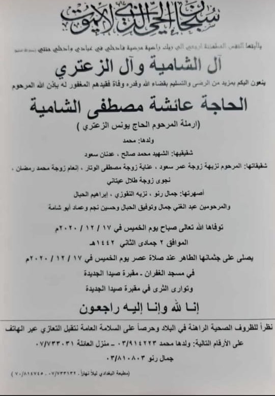 وفاة والدة الصحافي محمد الزعتري الحاجة عائشة الشامية