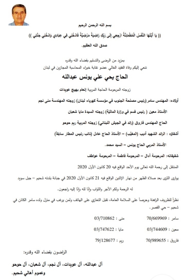 شكر وعرفان لكل من شارك في عزاء والدة القاضي زاهر حمادة