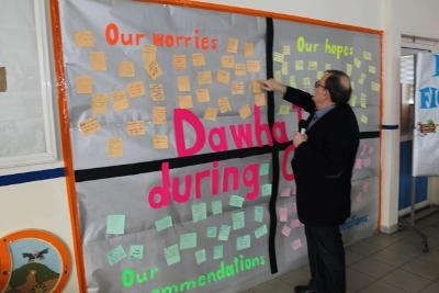 وفي الختام أجاب الدكتور البزري على أسئلة ومداخلات الحضور حول موضوع الندوة وذلك من خلال جدارية حملت كلّ المخاوف والصعوبات والآمال التي ترافق فريق عمل دوحة المقاصد.