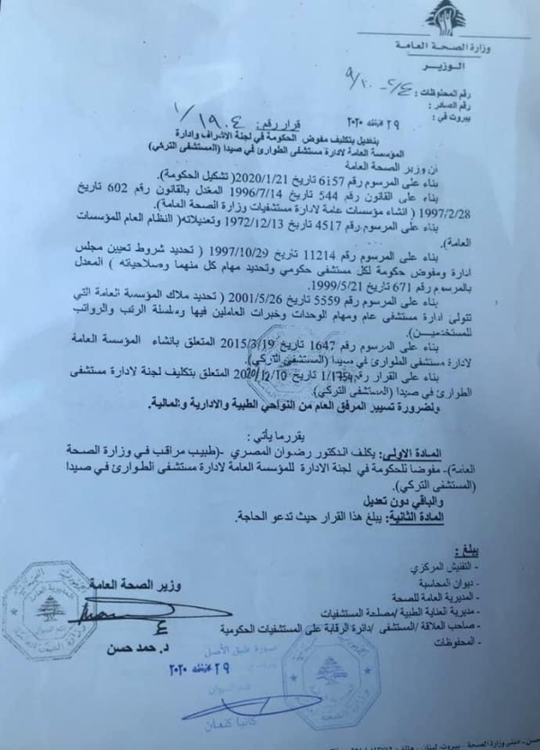 واصدر وزير الصحة العامة الدكتور حمد حسن قرارا وقع بتاريخ 29 كانون الأول 2020 قضى بتكليف الدكتور رضوان المصري (طبيب مراقب في وزارة الصحة العامة) مفوضاً للحكومة في لجنة الإدارة للمؤسسة العامة لادارة مستشفى الطوارىء في صيدا ( المستشفى التركي).