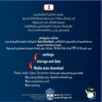 2-إعادة ضبط خصائص الحماية لجهة عدم اعتماد خاصّية التحميل التلقائي ""Auto download للصور أو لمقاطع الفيديو الواردة، سواء بواسطة الـ Wi-Fi"" أم بواسطة الـ"Mobile Data" عبر اتّباع الخطوات التالية: