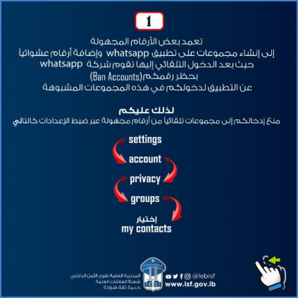 1-عدم تمكين مجهولين من إدخالكم –تلقائياً-إلى مجموعات مشبوهة، من خلال ضبط إعدادات الخصوصية (Privacy) في "واتساب" عبر اتّباع الخطوات التالية: