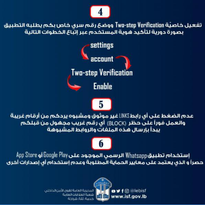 4-عدم تزويد الآخرين بالرمز "6-digit code" –الوارد بواسطة رسالة قصيرة "SMS"- الى الرقم الخاص بالمستخدم لتفعيل تطبيق "Whatsapp"، وذلك لعدم قرصنة التطبيق، حتى وإن وردت هذه الرسالة من أشخاصٍ تعرفهم.