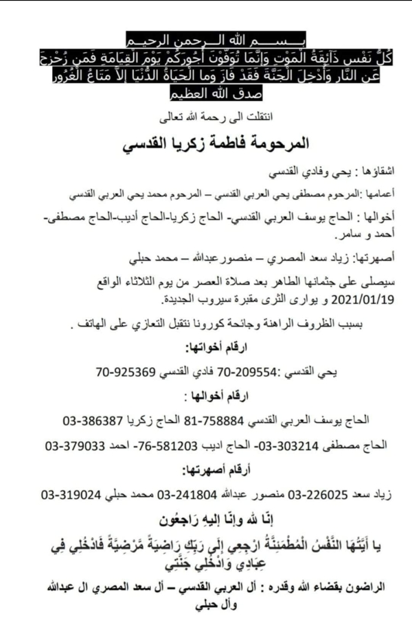شكر وعرفان لكل من شارك في عزاء والدة القاضي زاهر حمادة