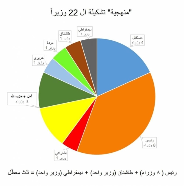 فبعيدًا عن إحدى أهم المغالطات المعيبة التي وردت في الرسالة ونطق بها المستشار أنطوان قسطنطين بلسانه، ومفادها صيغة حكومية من 19 وزيرًا، وهو رقم مفرد لا يتطابق مع "المناصفة" الملزمة في الحكومات، فإن "الثلث المعطل" بقي النجم الساطع في كل الصيغ الواردة في الورقة ، كما يبدو في الجدول المرفق.