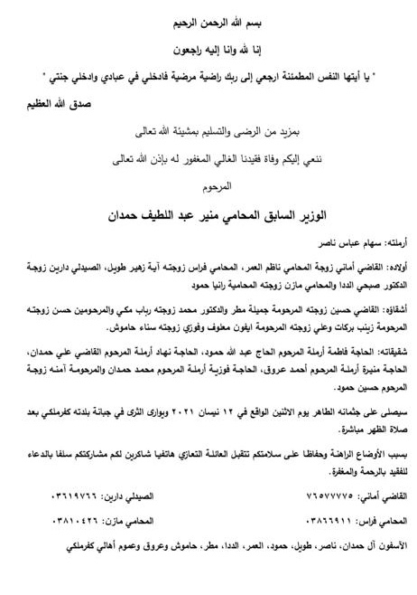 وفاة الوزير المحامي منير عبد الطيف حمدان