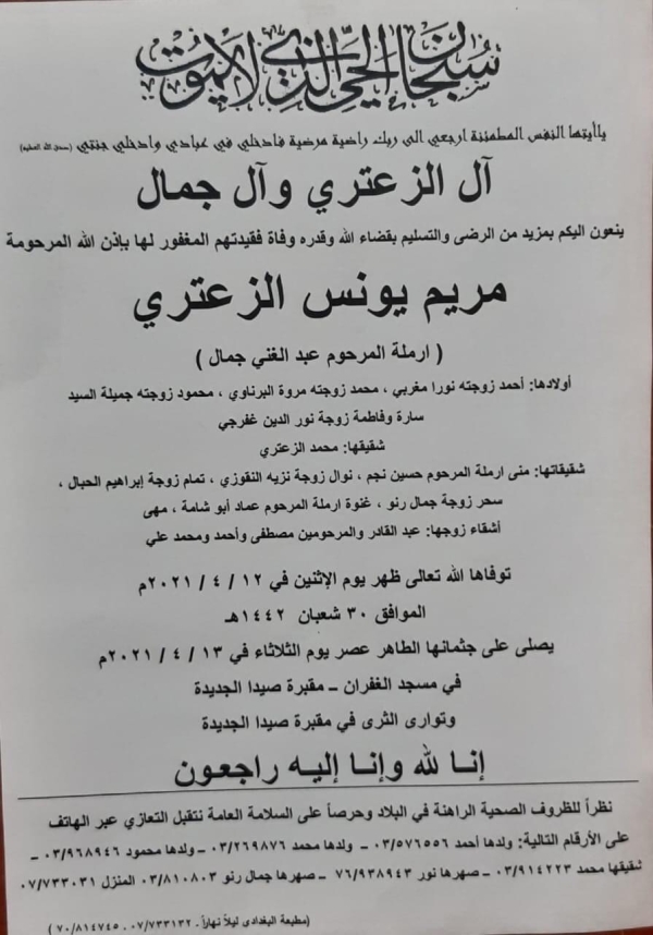 شكر وعرفان لكل من شارك في عزاء والدة القاضي زاهر حمادة