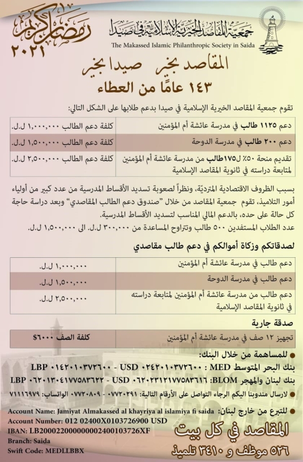 إن دعم ومساندة "جمعية المقاصد- صيدا " في ظل استمرار الظروف الصعبة في البلاد هو دعم ومساندة للمجتمع الصيداوي بأكمله..