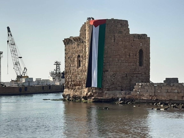 ارتفع علم فلسطيني عملاق مساء اليوم على احد ابراج قلعة صيدا البحرية في رسالة تضامن لبنانية فلسطينية من عاصمة الجنوب ومخيماتها لأبناء الشعب الفلسطيني الصامدين والمقاومين في القدس وغزة واستنكارا للعدوان الاسرائيلي على القطاع.