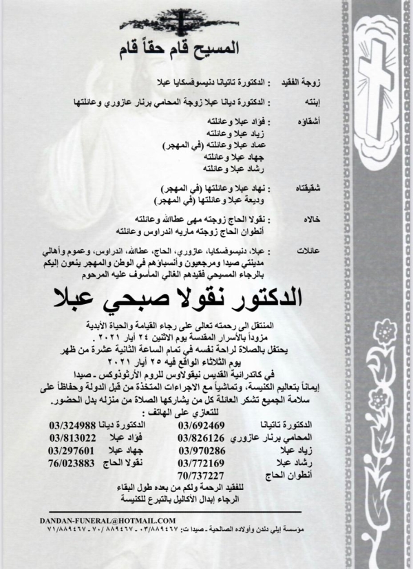 الدكتور نقولا صبحي عبلا الدفن 25-5-2021 آل عبلا ودنيسوقسكايا وعازوري والحاج وعطاالله واندراوس وعموم اهالي مدينتي صيدا ومرجعيون