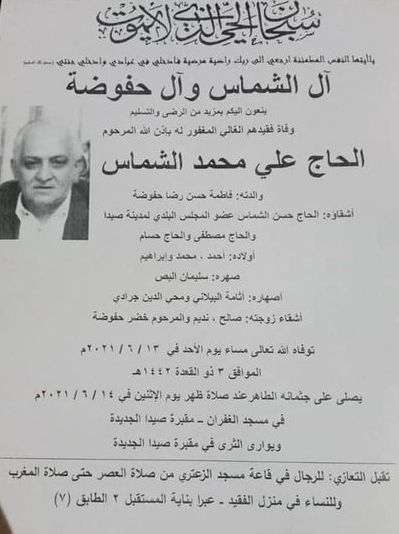 يتقدم مجلس بلدية صيدا برئاسة المهندس محمد السعودي ، بأحر التعازي القلبية إلى عضو المجلس البلدي الحاج حسن الشماس، وإلى عائلته الكريمة، بوفاة شقيقه المرحوم الحاج علي محمد الشماس الذي وافته المنية مساء أمس الأحد، حيث تجري مراسم الصلاة على جثمانه ظهر اليوم الإثنين 14-6-2021 في مسجد الغفران ويوارى في الثرى في مقبرة صيدا الجديدة.